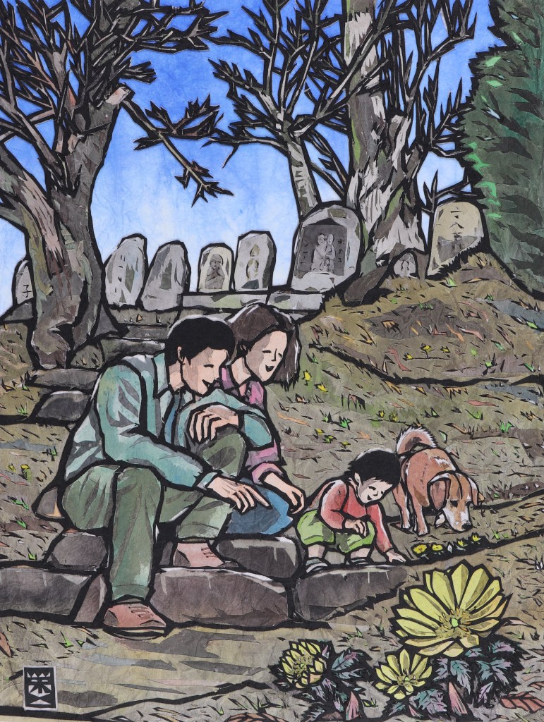 ここ沢底地区は、南向きの土手に数え切れないほどの福寿草が咲き誇ることでも知られています。福寿草が雪を押しのけて顔を出し、黄金色に輝く花を咲かせています。それを見つけた男の子が歓声を上げました。