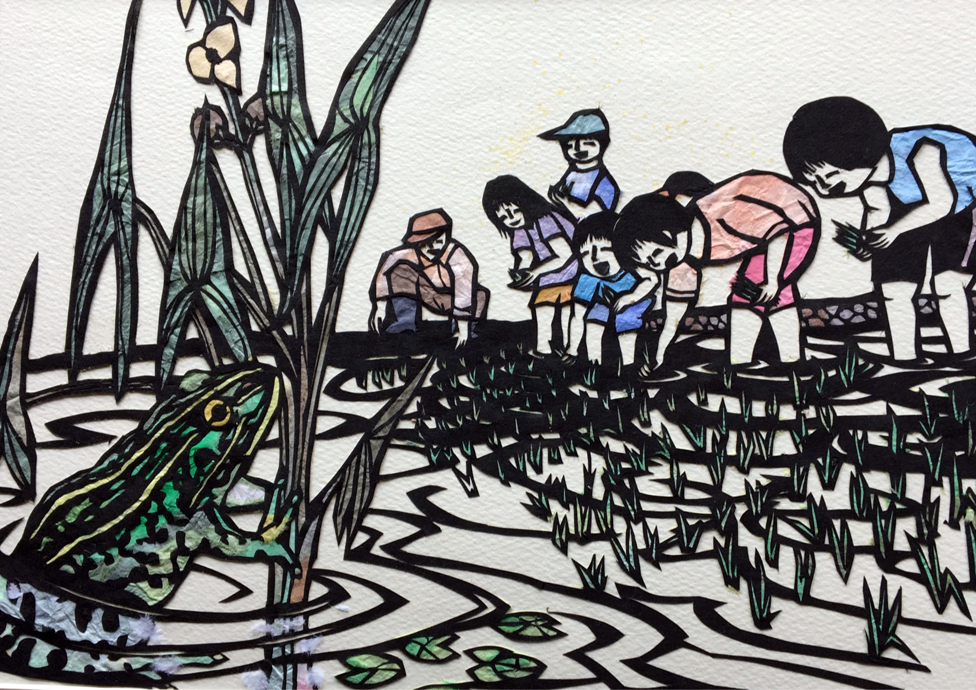 田植え1 「あめんぼだ」 「ゲンゴロウだよ」 「カエルだ」 「こっちにも」 土を耕して、水を入れた田んぼに田植えに来ました。その田んぼの中にいろいろな生き物がたくさんいて、しばしジーっと見つめている子ども達です。中でもカエルはいっぱいいて、子ども達が近くにいる昼間なのに鳴いているカエルもいます。 「先生、このたくさんのカエル達は どこからやってきたのかなあ」 「近くの林とか土手で冬をこして、田んぼに水が入ると卵を産むチャンスだから、やってくるんだよ」 「へえ」 「鳴いているのは、雄で雌を呼んでいるんだってよ。『おーい彼女、ちょっと僕のところに来ないかい』ってなかんじかな」 「えっ、そうなんだ」 「雌は『わっ、いい男』って気に入った雄がいると卵を産むんだよ」 「ふーん、それでゲロゲロって鳴いてるのか」 そんな話を聞いたせいかカエルの鳴き声をまねして 「ゲロゲロ、ゲロゲロ」 と言いながら、田植えが始まりました。 「あっ、○○ちゃんの足下にカエル。きっと『いい男』って飛んできたんじゃない」 続きを読む: IMG_6604