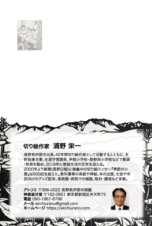 伊那谷出身の切り絵作家 浦野栄一の公式ホームページです。子どもと自然をキーワードに、切り絵教室、展覧会、オリジナル制作などを行っています。