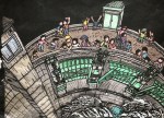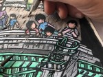 美和ダムと同じ構図にならないようにと思ったり、特徴であるアーチ型を描きたい。放水を表したい。蓄えられた湖の美しさや湖面に映し出される山々を表したい。人々も描きたい。表したいものが多くて、構図に苦労しました。