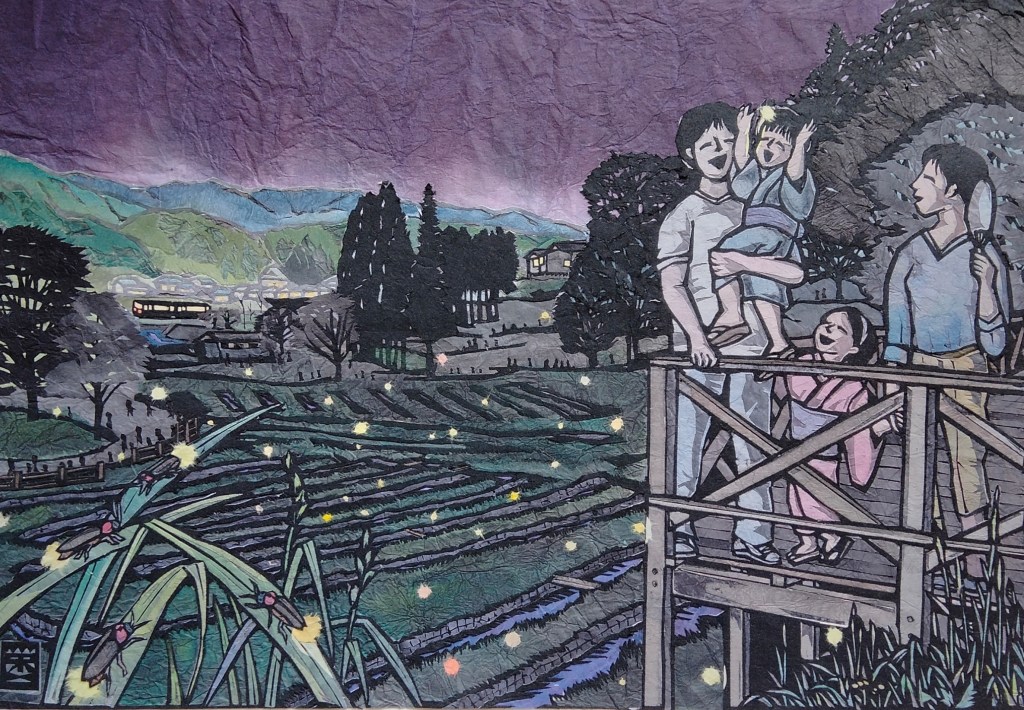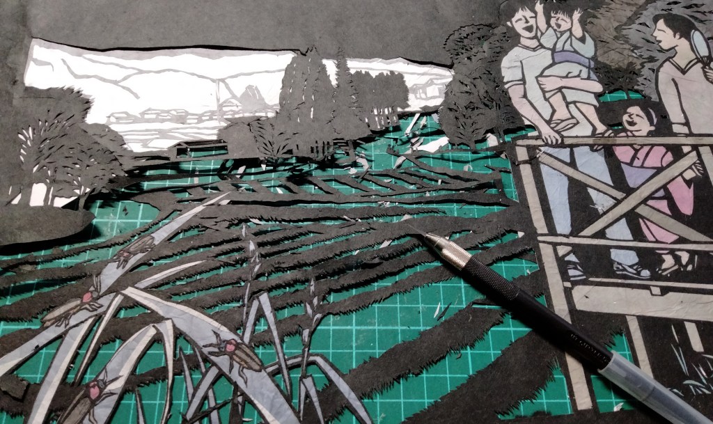 高台からその蛍を眺める親子と、その向こうには暮れかかった辰野の町並みを切り出しました。特に遠景のところは黒や灰色の紙をもとに色和紙も重ねて切り抜きながら作ってみました。