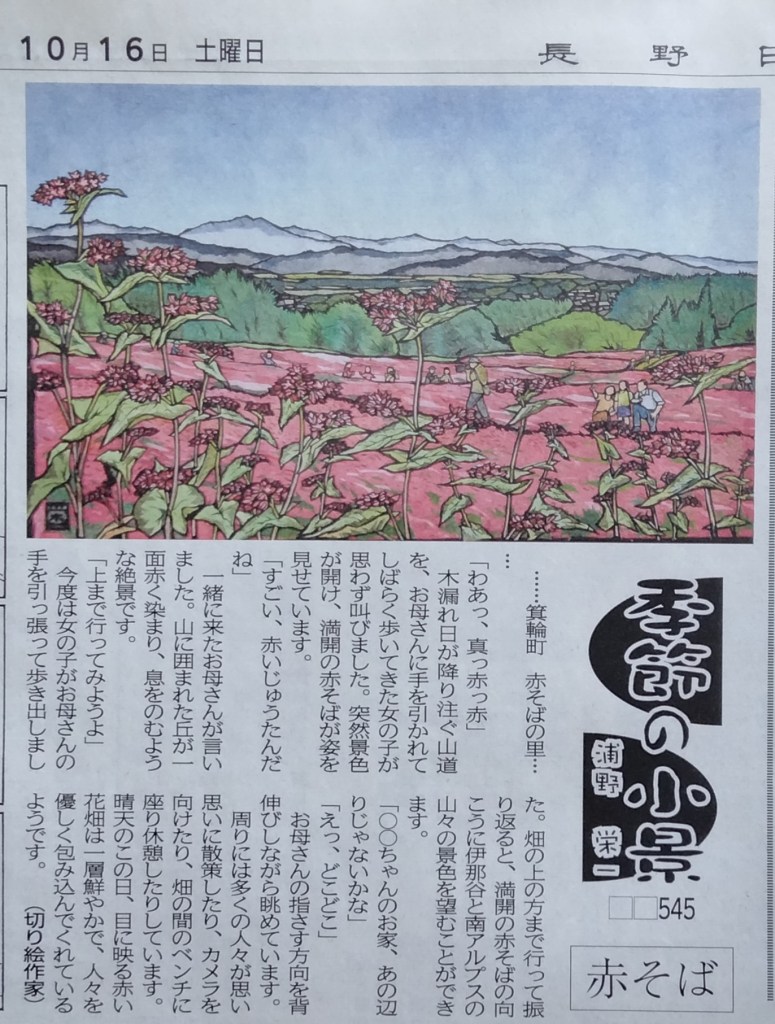9月はじめにもう一度訪ねました。蕎麦が生き生きと育っていて、今年は赤そばの絨毯を見ることができるぞと嬉しくなりました。畑を下から見上げていたのですが、天気が良かったので気分よく畑の上まで上って見下ろすと、広い畑の向こうに伊那谷の街並みや遠く南アルプスの山並も見渡せる風景に思わず見入ってしまいました。こんな感じを何とか絵にしたいと思って、家に戻ってから作品を制作し始めました。蕎麦の花の表現、山々を見渡せる構図など様々に試行錯誤しながら制作していきました。そのころ新聞やテレビニュース等にも箕輪町の赤そばが咲き始めた話題などが載りはじめました。何とか作品が出来上がりました。