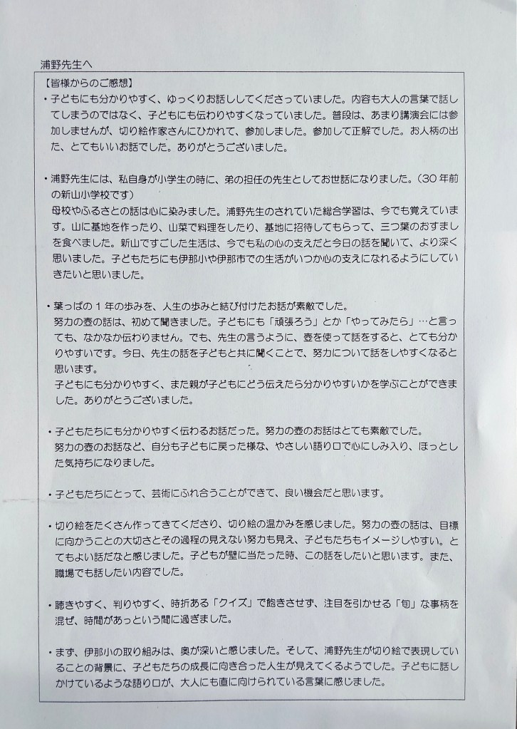先日、その感想の一部を見せていただきました。好評だったとのことで、以前お世話になった学校に少しは恩返しができたかなと思ったところです。