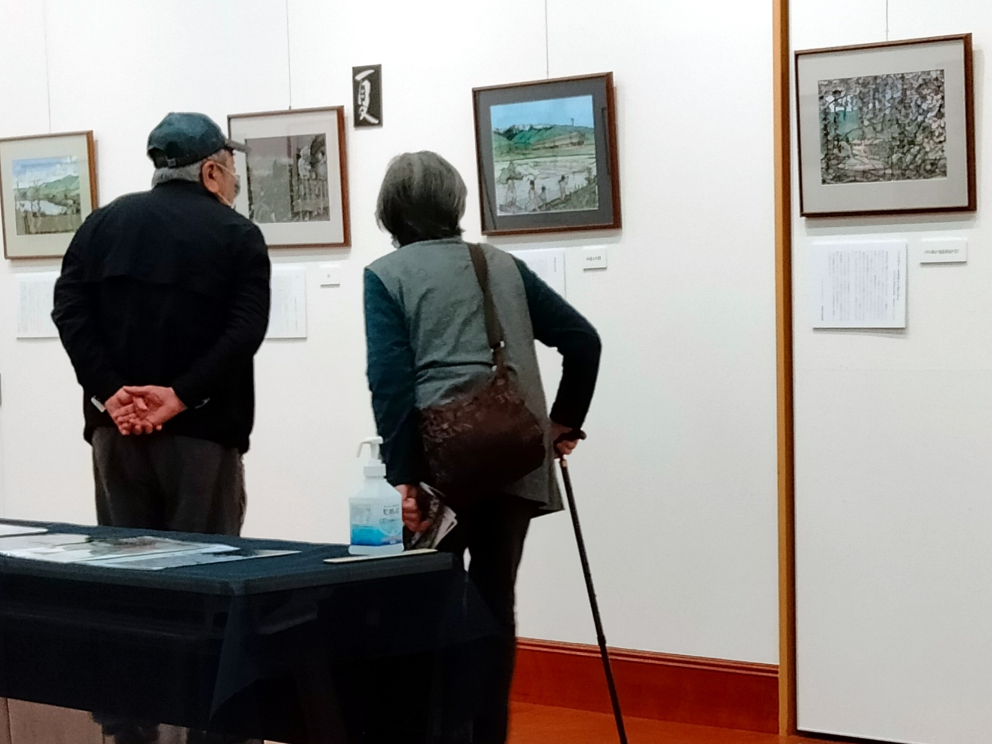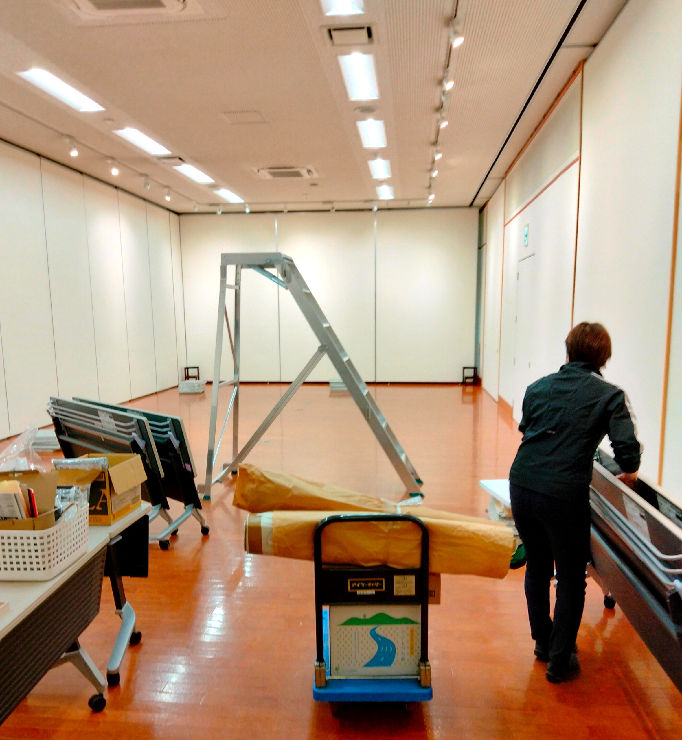 28日からかんてんぱぱホールでの個展が始まりました。初日は飾りつけを午前中に終えて、午後1時から開場予定としていました。ところが実際に始めてみると思った以上に時間がかかってしまい、開場時刻となってもまだドタバタと準備をしている状態。しかし、その時刻に駆けつけてくださる方もいたり、新聞やテレビの取材の方もいたり、準備をしているままの服で、しかも汗をかいたよごれた顔での対応となってしまいました。