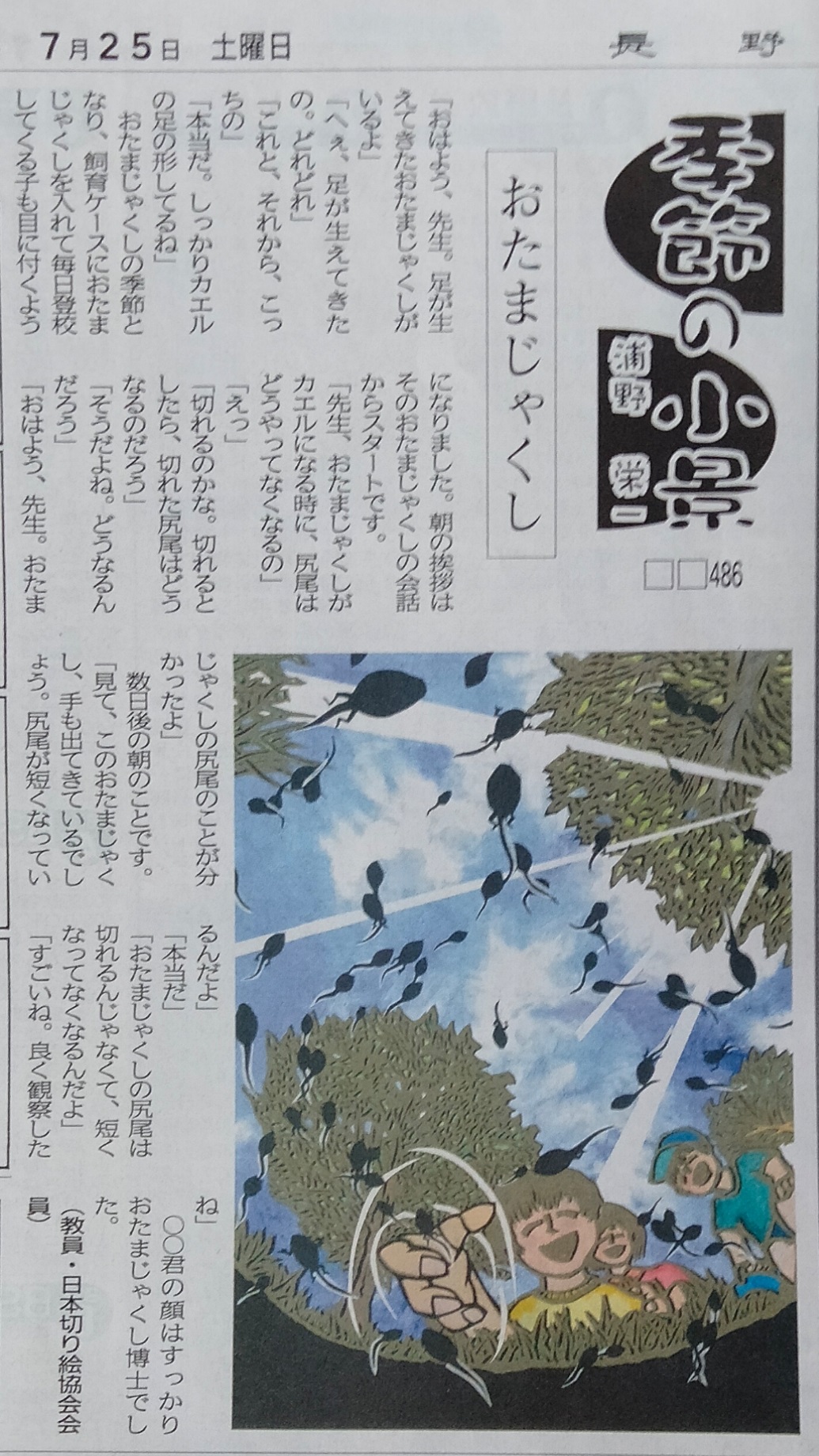 今回の展覧会では今まで新聞に作品を掲載した新聞記事を会場に閲覧できるように置いておきのました。ある男性がたくさん積んであった記事の中から「この新聞のおたまじゃくしの作品を購入したい」と依頼されてきました。その作品は以前希望者があって販売してしまったものだったので、もう一度制作することならできますとお答えすると、それでいいとのこと。お話をしていくとかんてんぱぱの社長さんで清酒今錦の社長さんでもある塚越さんでした。「なかなかおたまじゃくしの絵はなくてね。ぜひ作ってくれたらうれしい」とのこと。清酒今錦には「おたまじゃくし」という人気のブランドがあります。そこでおたまじゃくしの切り絵を飾りたいとのことでした。