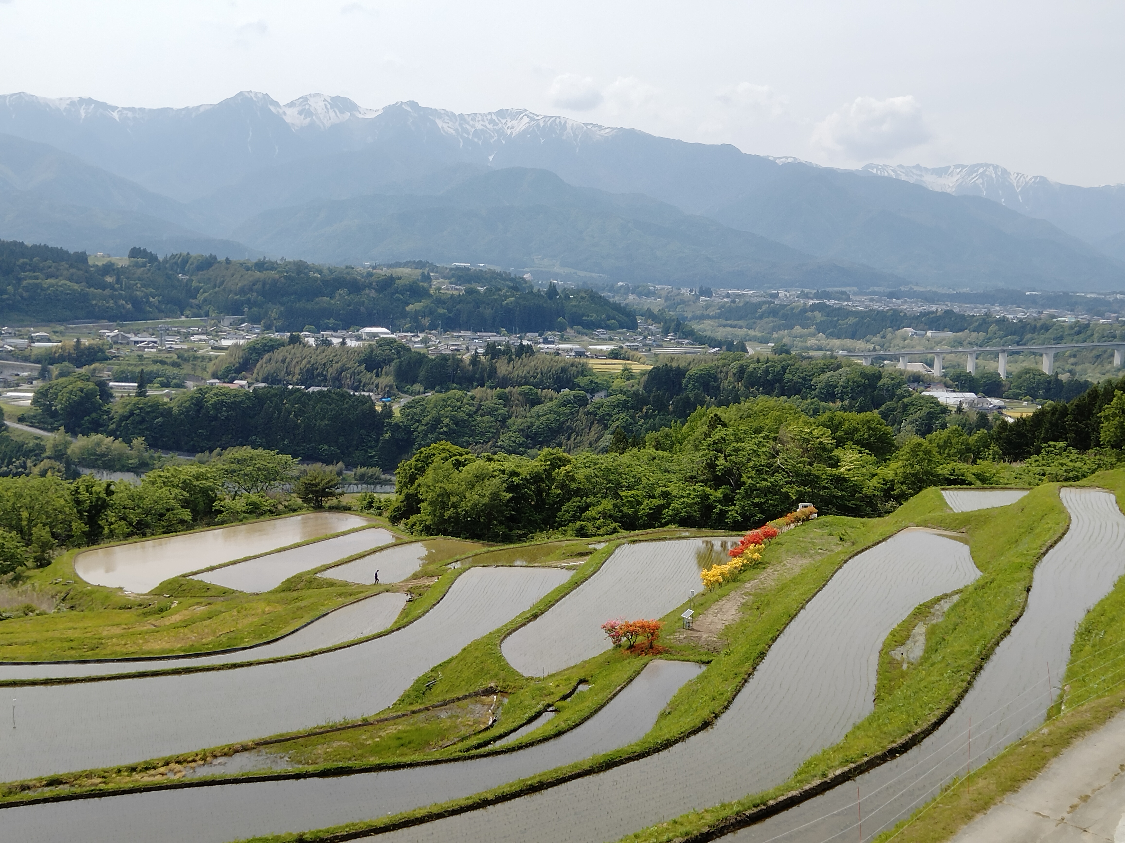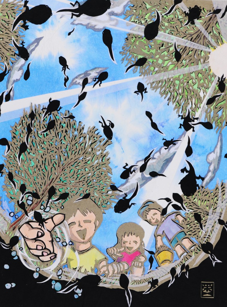 作品を作る前に今錦の酒蔵や「おたまじゃくし」に使う酒米を栽培する棚田を訪問してそのイメージを持ちながら制作しました。制作しているうちに遊び心がでてきて、「今錦」の文字とおたまじゃくしのラベルに使われている「おたまじゃくし」を絵の中に入れてみようかと制作してみました。