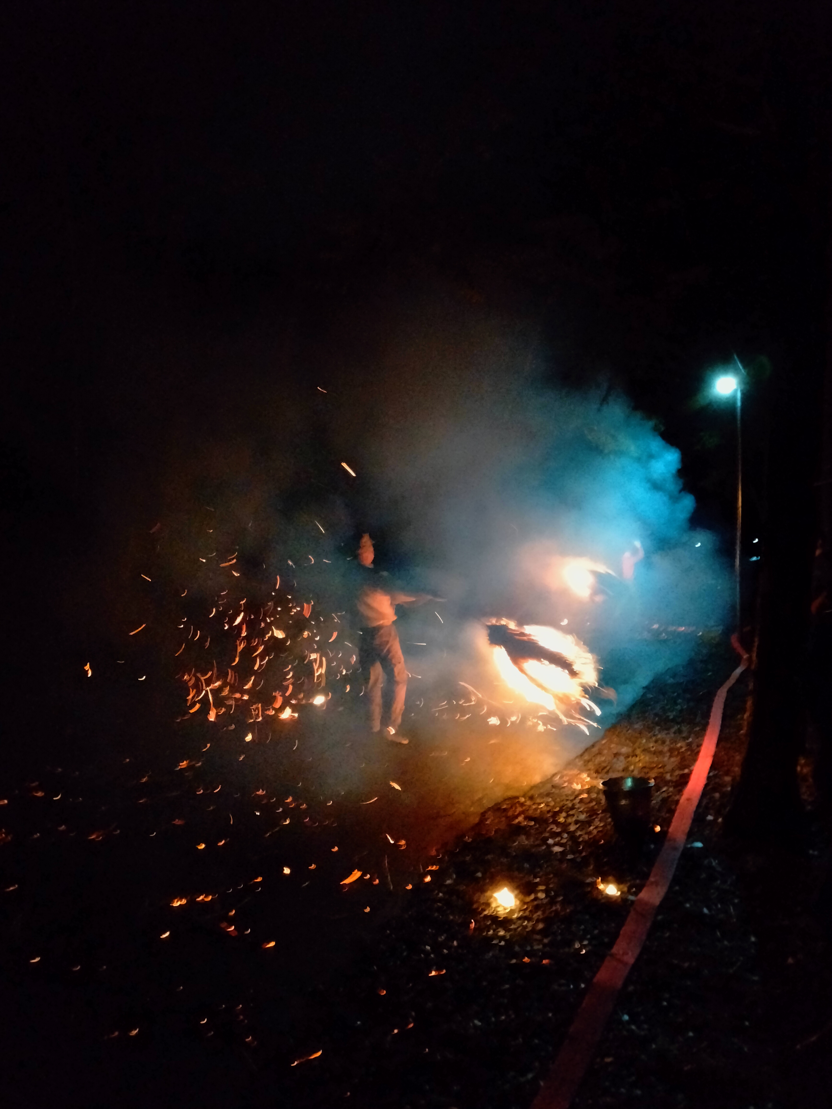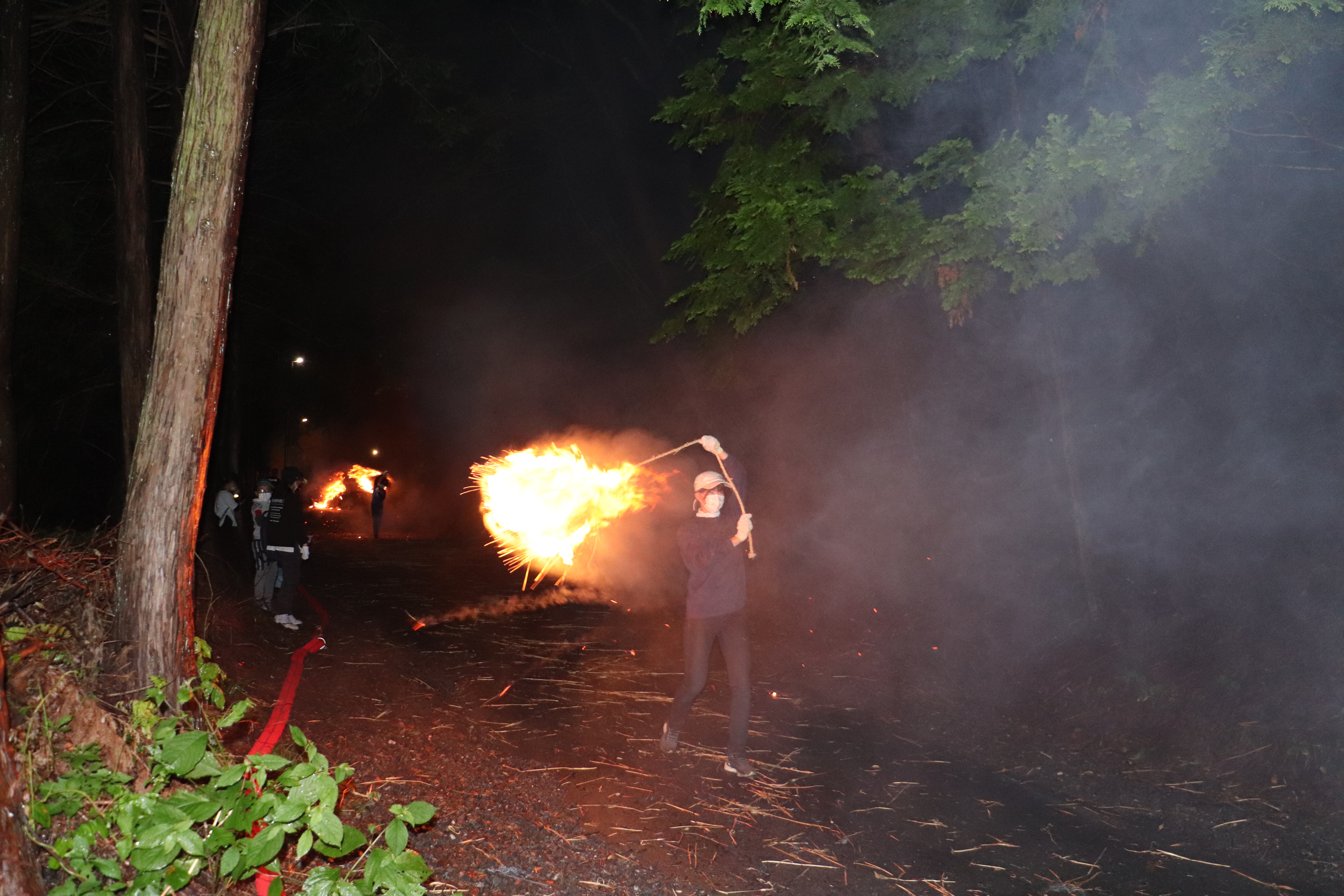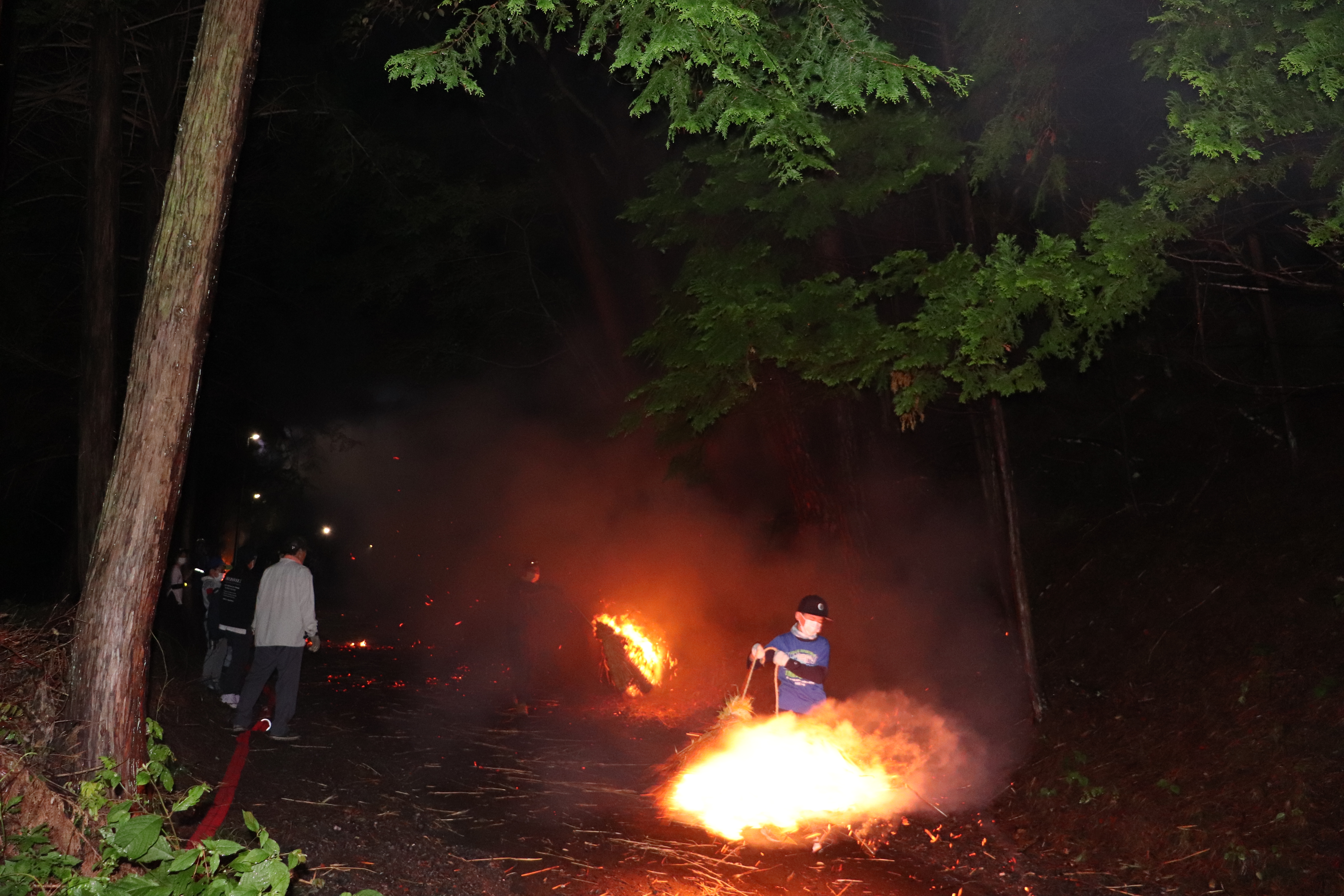 闇夜の中で勢いよく振り回されたわら束が、鮮やかなオレンジ色の輪を描いていく様子は幻想的で迫力満点です。