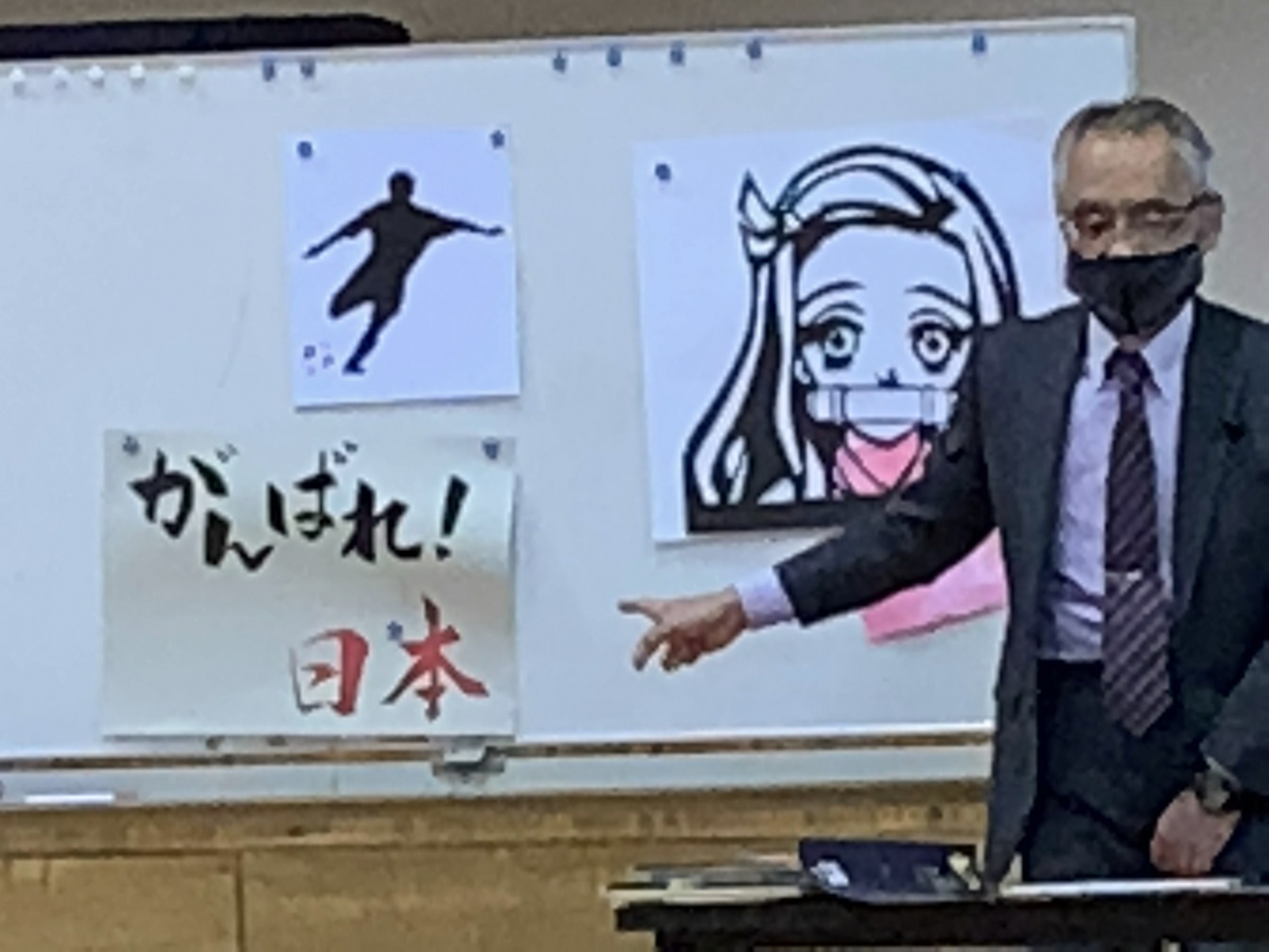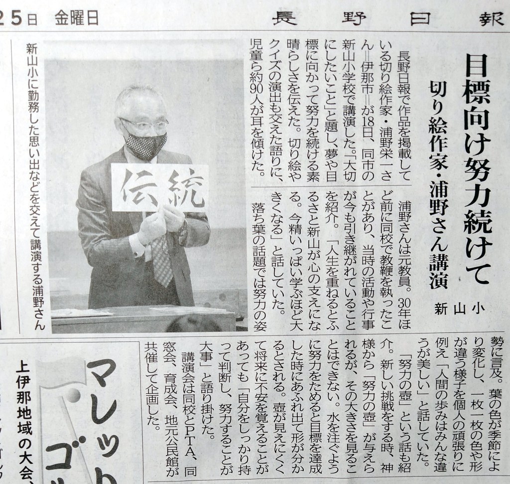 辰野西小……コロナの影響で6年生は対面、他の学年はズームでの講演でした。6年生は私が退職する時の1年生で、「校長先生の話いつも切り絵がたくさん出てきたのを覚えているよ」と話してくれました。