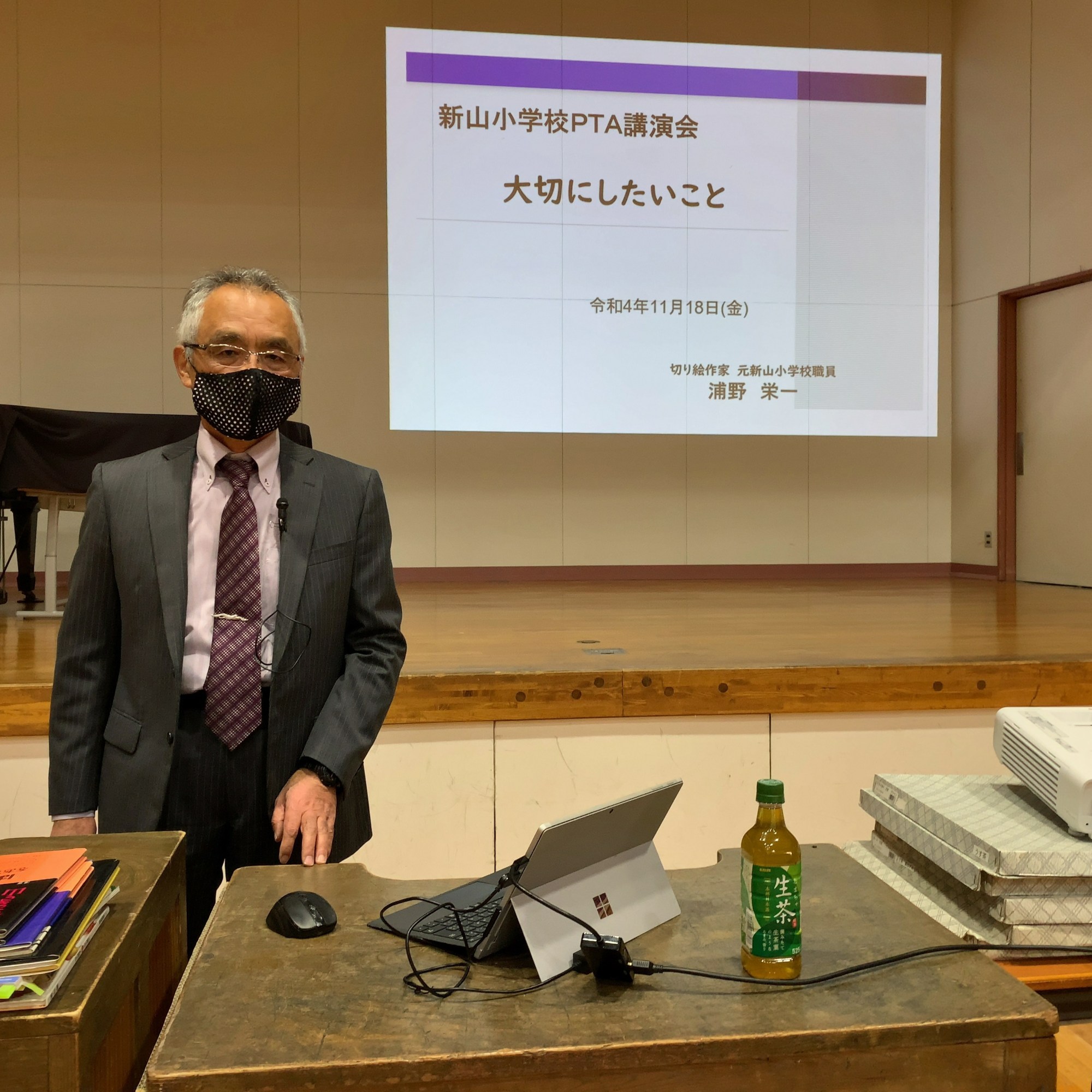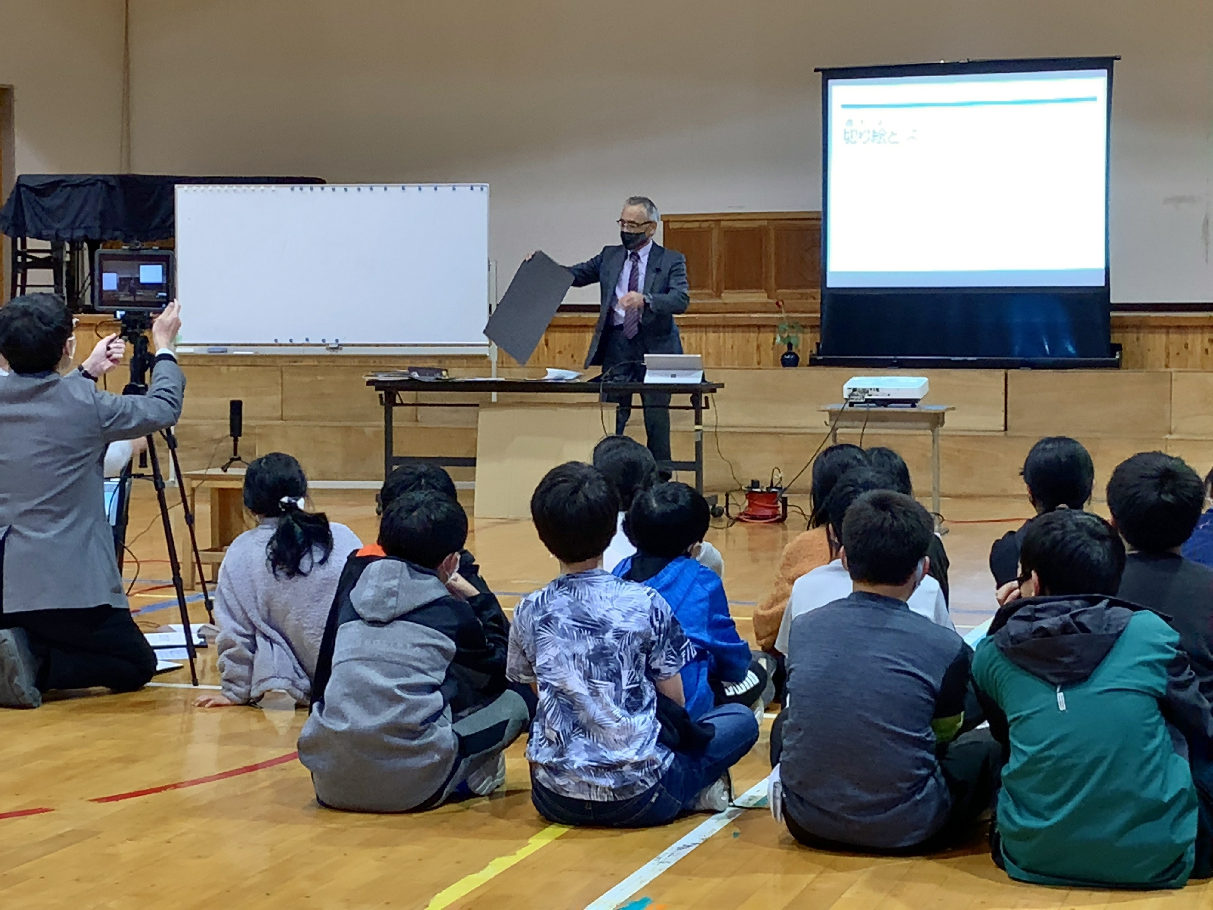 新山小……全校児童と保護者や地域の方にお話ししました。子どもたちの反応が素直で、ついついそれにのせられるように30年前にテレビニュースに取り上げられた動画なども使って、時間を忘れて話をしました。