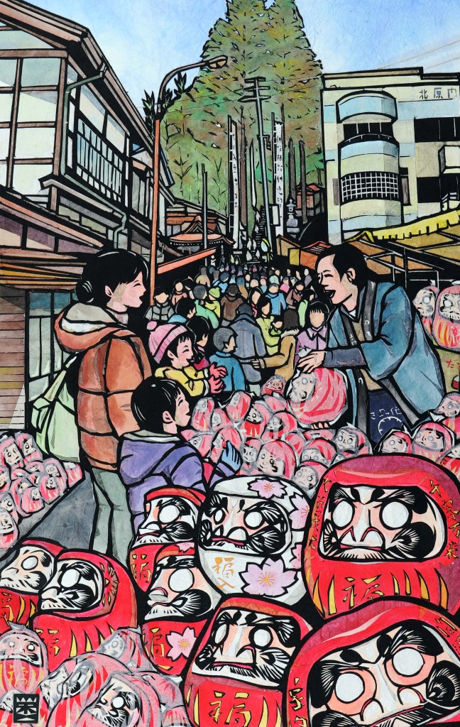 まずは鉾持神社に向かいます。参道の露店の間を抜け、木立の中の約三百段の長い石段をはぁはぁ言いながら登りきると、風格のある神社が現れます。家に置いていただるまを返納してお参りです。その後、足元に高遠の町並みを望みながら慎重に石段を下りてくると、露店に戻ります。参道に並ぶ露店は縁起物で溢れ、だるまやお守りを買い求める大勢のお客さんで賑わっています。ここで幸運をもたらすという縁起物の『福だるま』を購入です。
