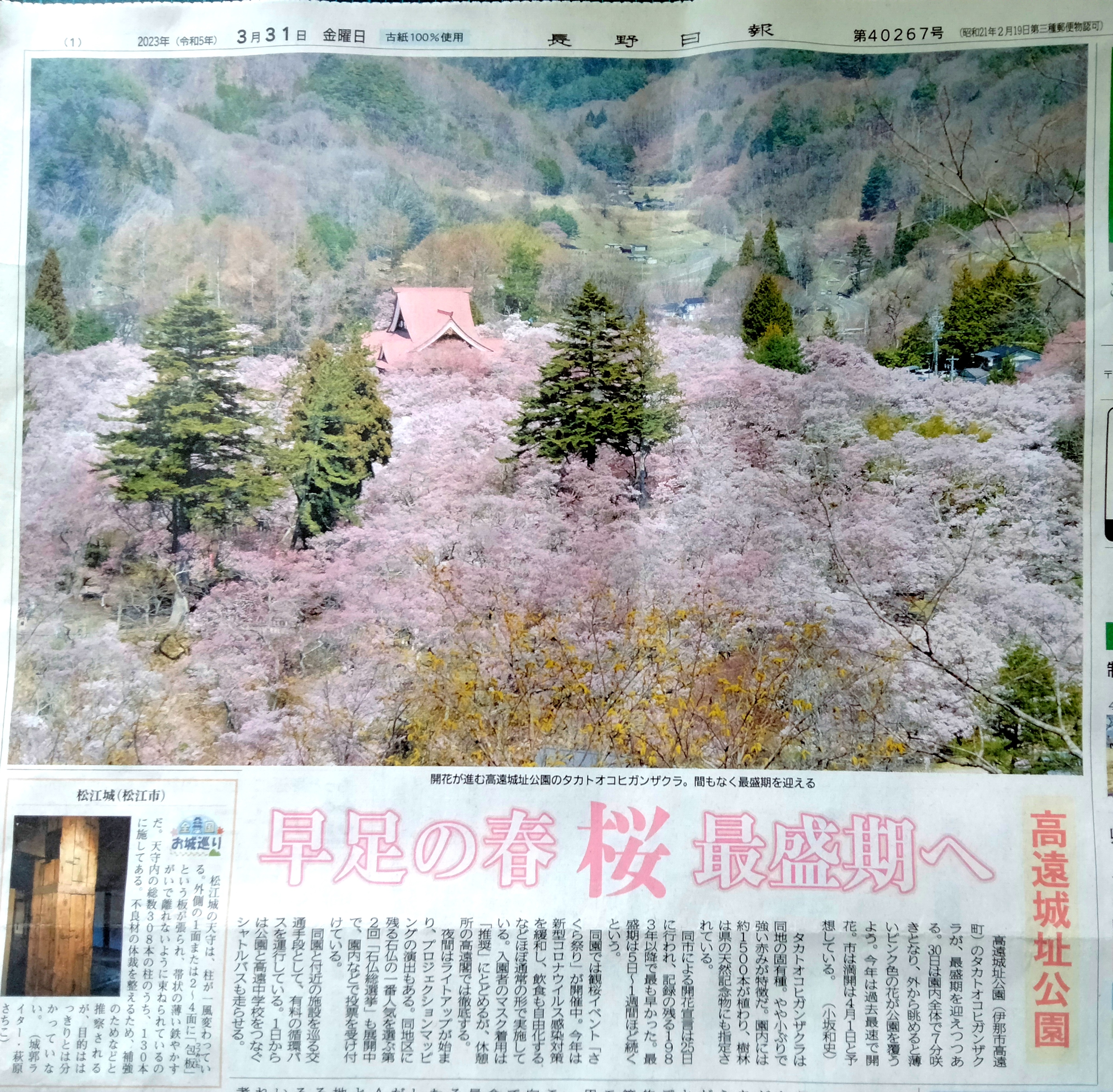 今年の桜は開花が早く、ここ伊那谷でも三月のうちに桜の便りが一斉に聞かれるようになりました。高遠城址公園の桜は有名ですが、他にもたくさん地域が誇る桜の木があります。箕輪町上ノ平の一本桜もそれはそれは素敵な桜です。