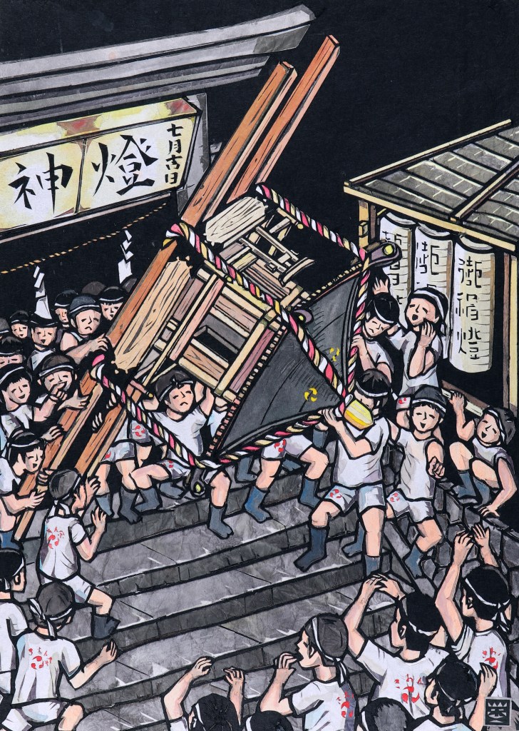 津島神社の石段の最上段まで担ぎ上げられた神輿(みこし)が、屋根を下にしてひっくり返されようとしています。周りの観客が息を呑んでそれを見守り一瞬あたりが静まり返った、その時です。