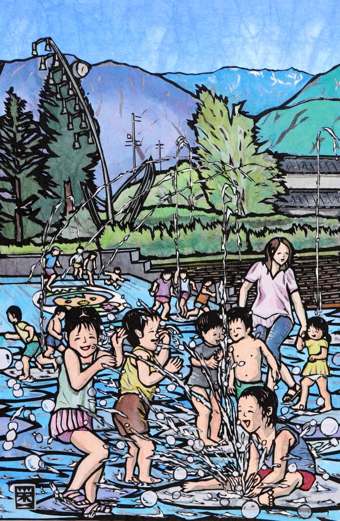 駒ケ根市には「こまかっぱ噴水」という人気の場所があり、子ども達の水遊びの声が響きました。