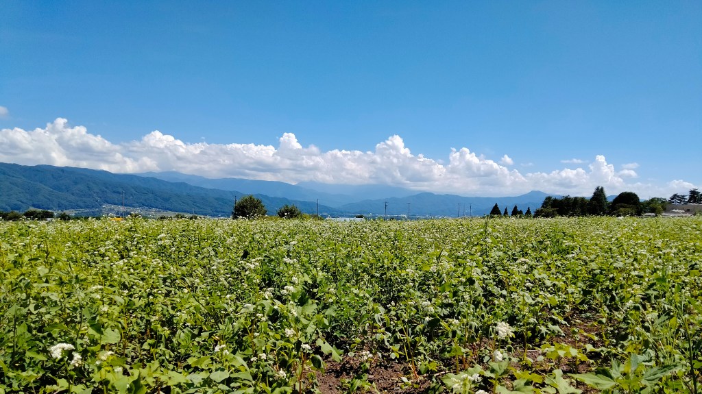 秋の澄み切った青空のもと爽やかな風に蕎麦の花がなびき、伊那谷のあちこちで見頃を迎えています。蕎麦の栽培が盛んな飯島町本郷地区にも、まさに白い絨毯のような蕎麦畑が広がって「アルプスの山々を背にした蕎麦畑」「蕎麦畑の向こうを通過する飯田線の列車」など、ここでしか見られない師玉の風景に出会い心がほっこりします。