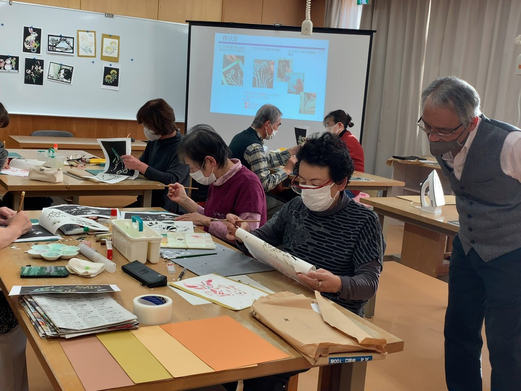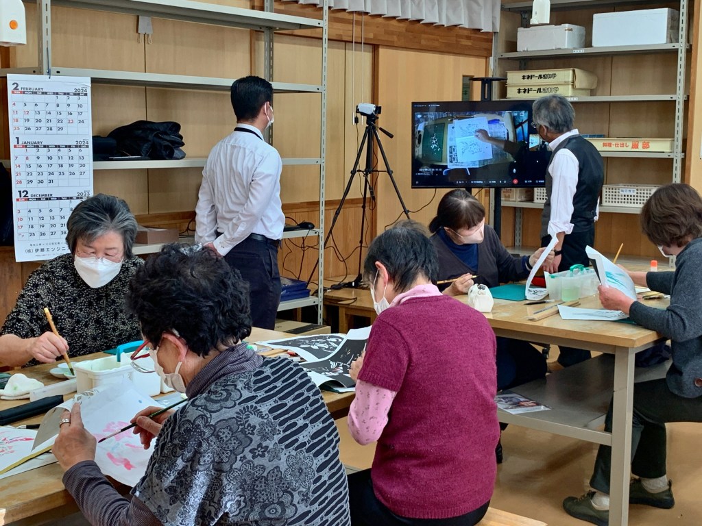 伊那市では「モバイル公民館」という視聴覚機器等を搭載したバスを使って、交流活動サービスを提供する事業を始めました。趣味の講座を離れたところにいるバスの中で実際に受講することができるのかどうか、私の切り絵講座で実験的にやってみることになりました。講座を実施するのは伊那公民館で、バスは離れた美篶公民館にあり、そのバスに2名の受講者がいます。