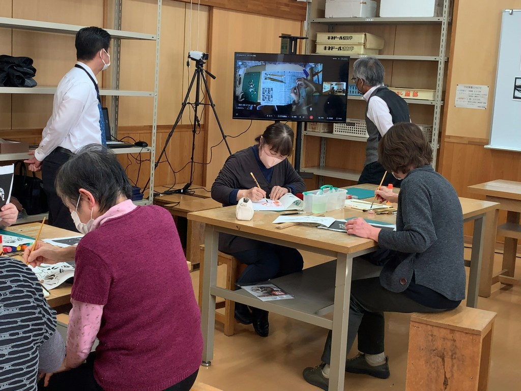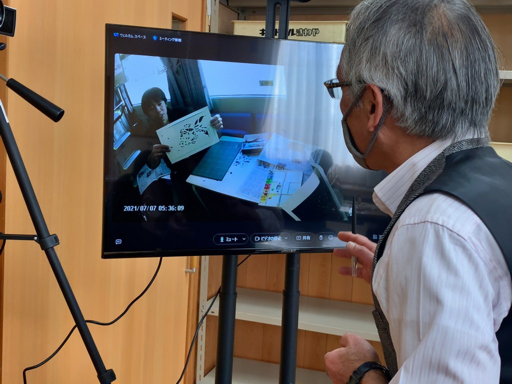 伊那公民館での講座の様子をカメラで撮って、バスに搭載されているモニターに送ります。伊那公民館の受講者の指導と同時に、モニターを通してバスの中の受講者の進捗状況を確かめ、指導したり質問を受けたりしながら作品を作ってもらいました。映像を通した指導になりましたが、思った以上に問題なく離れた場所でも作品が出来上がりました。