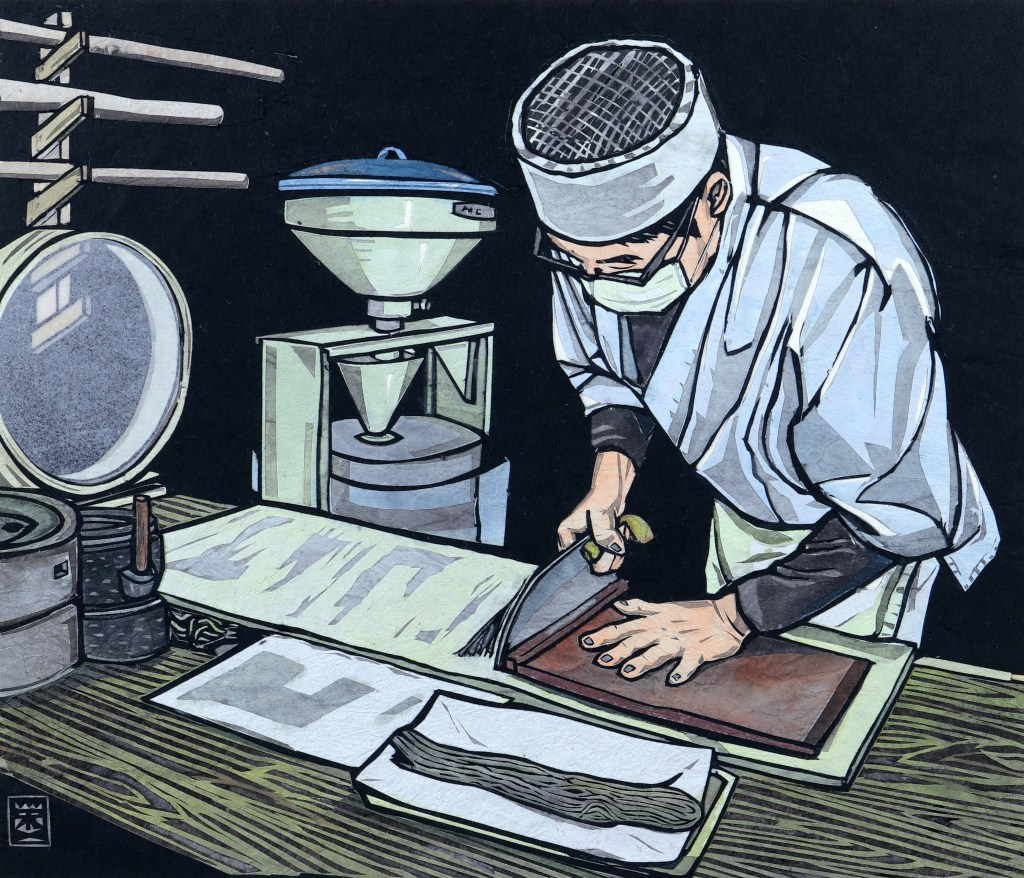ここはそばの種類により挽き方や打ち方を変えて毎日数種類のそばを提供しています。開店前の忙しい時間帯に、その日に提供するそばを打つ様子を拝見させていただきました。粉を混ぜあわせてこね、包丁で切り終わるまで、手際よくしかも細心の注意を払いながら作業されており、極上のそばの味を想像しながらシャッターを切らせていただきました。打ち終わったそばを切る音が静かな店内に響いていく様子を思い出しながら切り絵を制作していくうちに、作品が3つも出来上がりました。