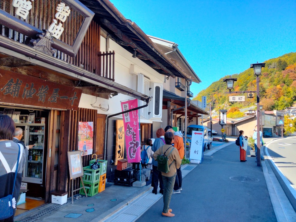 秋の青空のもと、紅葉した木々を眺めながら高遠城址公園のそば祭りを楽しみました。その後「ご城下通り」沿いにある開店前から行列ができる人気のそば屋さんを訪れました。
