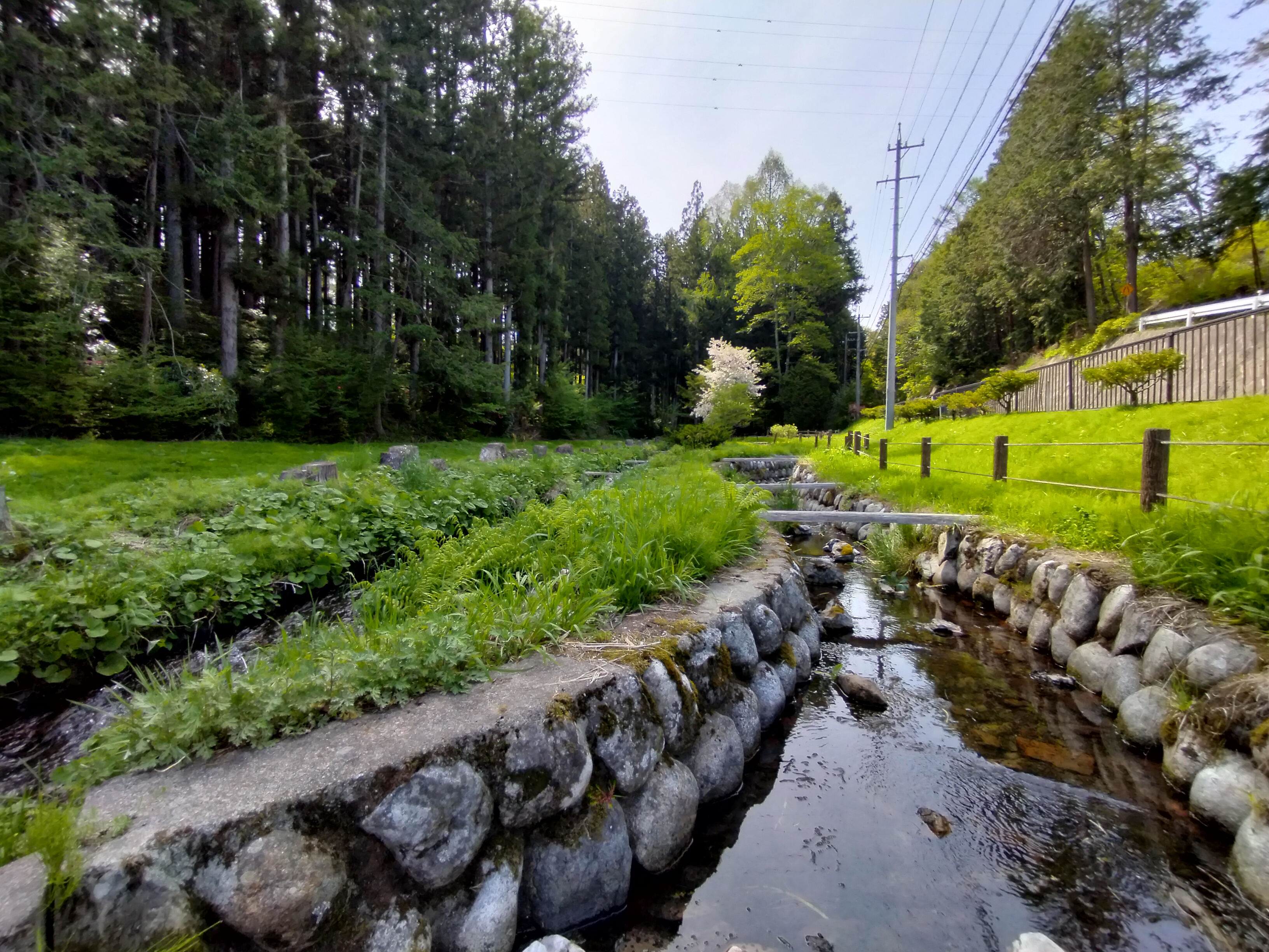 段丘崖から湧き出る豊かな伏流水が注ぎ込む半沢川。この清流には水芭蕉やワサビが生育し、自然の美しさが際立ちます。