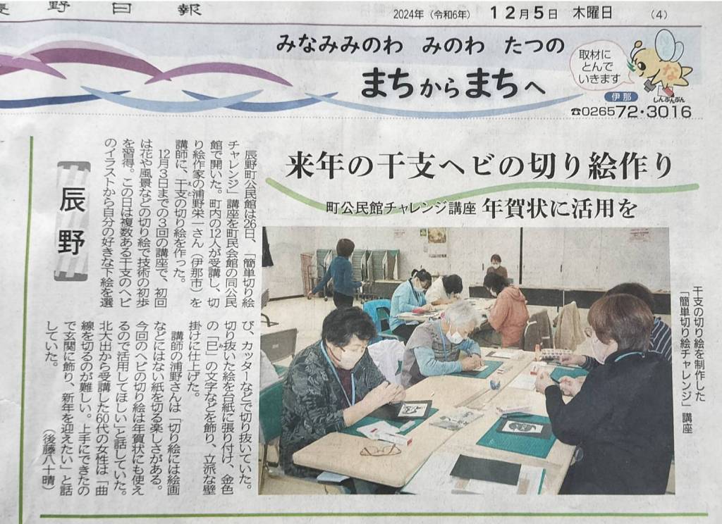 今年の10月から12月にかけて、5つの公民館や団体から依頼された切り絵講座を無事に終えることができました。単発のものから数回にわたる講座まで、様々な形式で実施し、延べ人数で160名ほどの方々にご参加いただきました。その多くが未経験者で、カッターナイフの使い方から作品制作まで、毎回完成作品を持ち帰れるよう工夫しました。