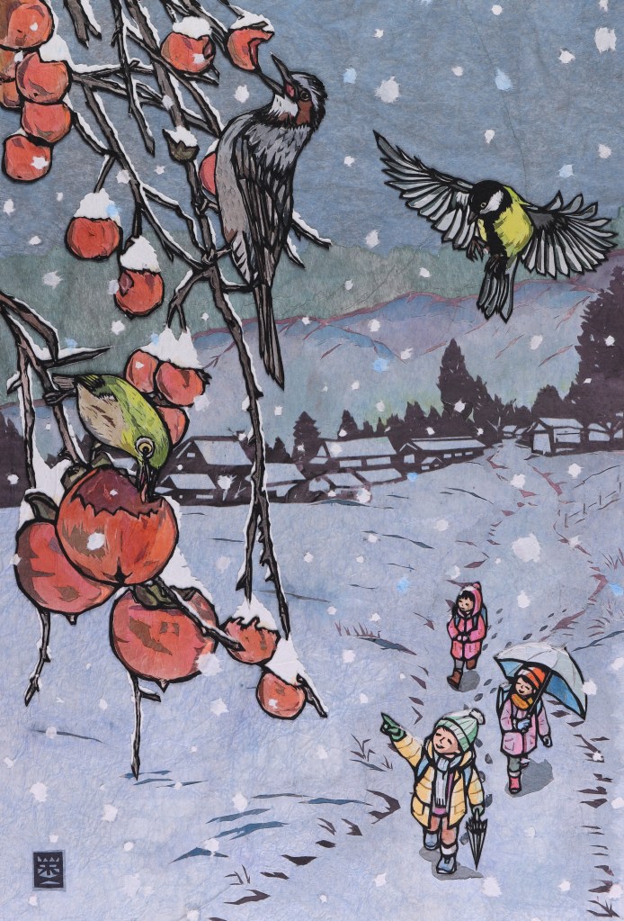 切り絵では、雪を纏った柿の木に、小さな野鳥がとまっている様子を表現しました。野鳥は、寒さに負けじと、赤い実にくちばしを伸ばしています。そして、木の下には、学校帰りの小学生が、その光景を興味津々に見上げている姿を配置しました。雪の白と柿の赤、そして野鳥の色と小学生の温かい色が、鮮やかなコントラストを生み出すように、丁寧にパーツを切り抜いていきます。細かな雪の表現や、野鳥の羽の質感にもこだわり、心を込めて制作しました。