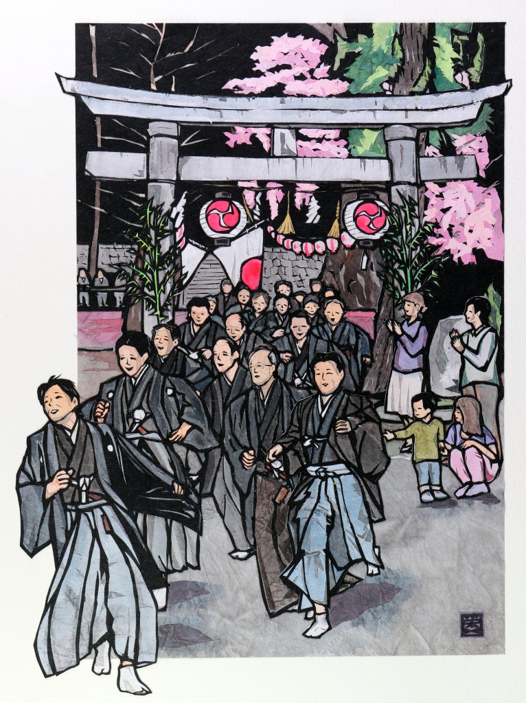 伊那市のやきもち踊りは、羽織袴姿の人々が神社で輪になり、足を高く上げて飛び跳ねる楽しい伝統踊りです。踊りの合間にはどぶろくや鮎の串焼きを楽しみ、和やかな雰囲気に包まれます。最後は踊り手が一斉に鳥居の外へ駆け出し、厄を持つ人を決めるユーモラスな場面も。満開の桜の下、地域の温かさと賑わいを感じられるお祭りです。そんなやきもち踊りを切り絵で表現したいと1年前にお祭りの様子を取材し今年のお祭りに合わせて作品を作りました。