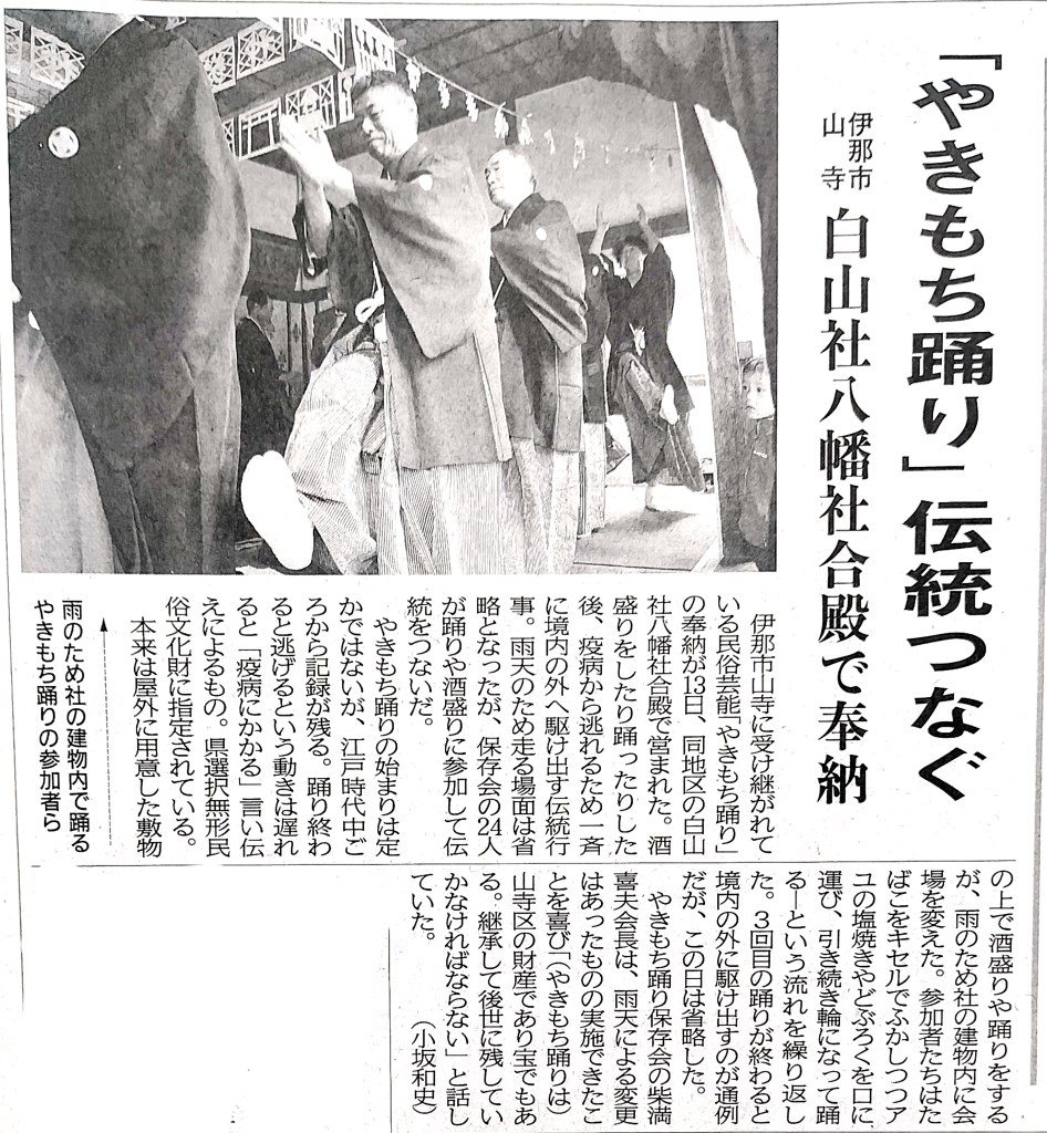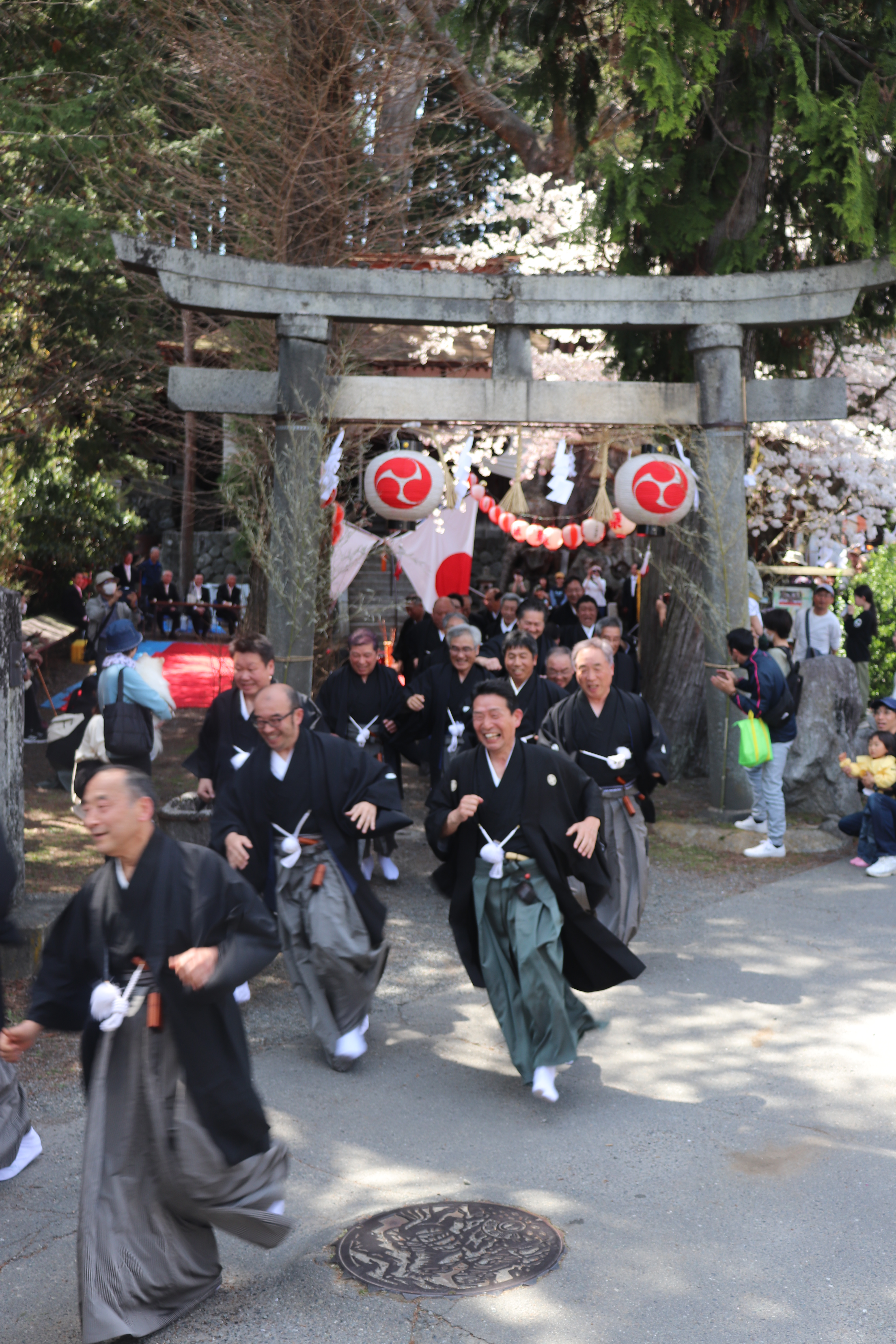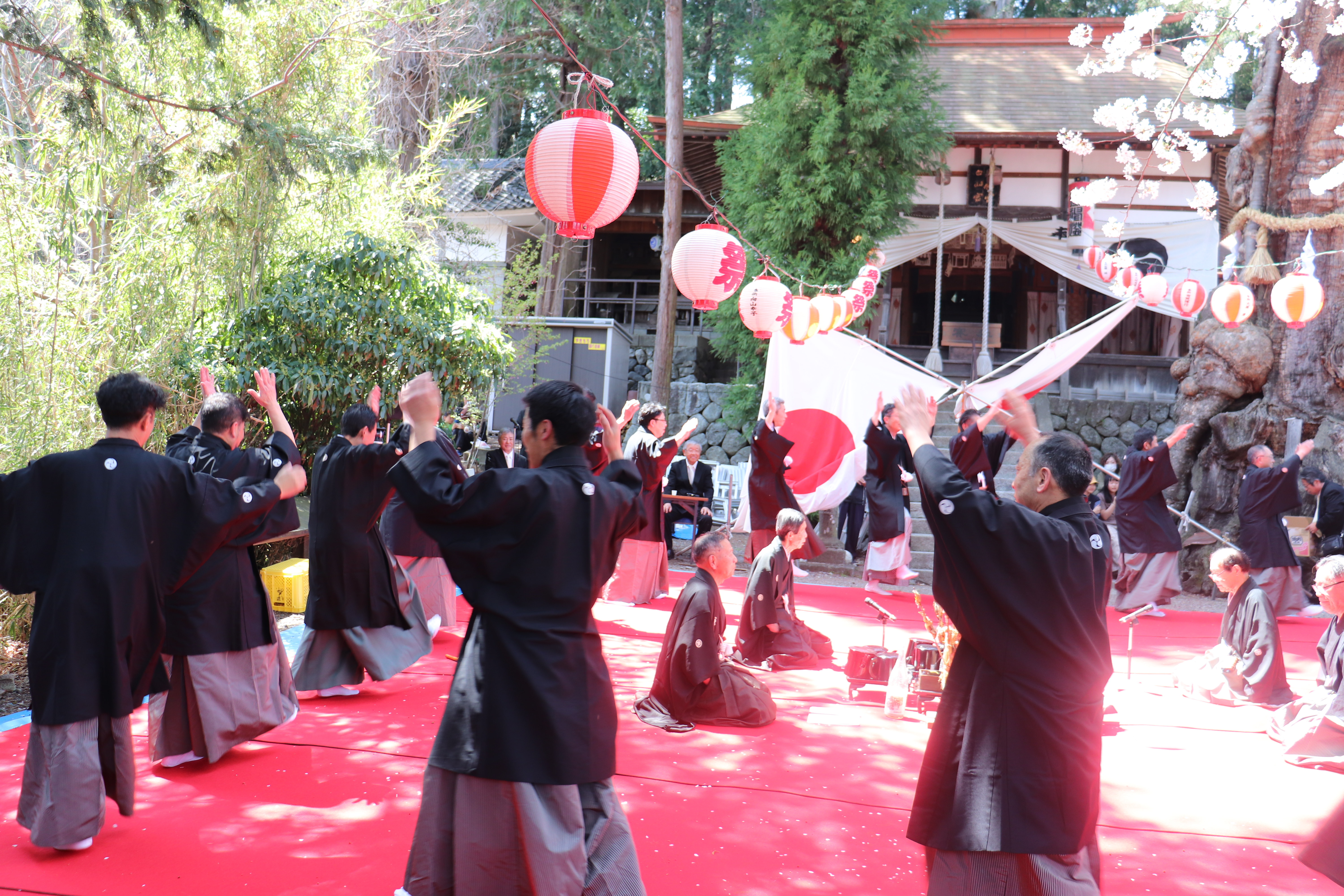 春の陽光が降り注ぐ伊那市山寺の白山社・八幡社合殿。そこで繰り広げられるのは、奇祭として名高い「やきもち踊り」です。羽織袴に身を包んだ男たちが神社の境内で輪になり、独特の節回しの歌に合わせて跳ねるように舞うその足取りはどこかユーモラスで、見ているこちらまで思わず笑みがこぼれます。