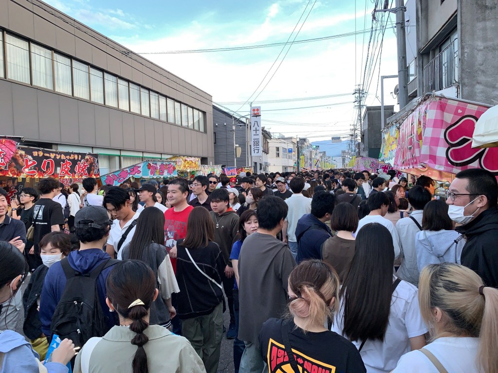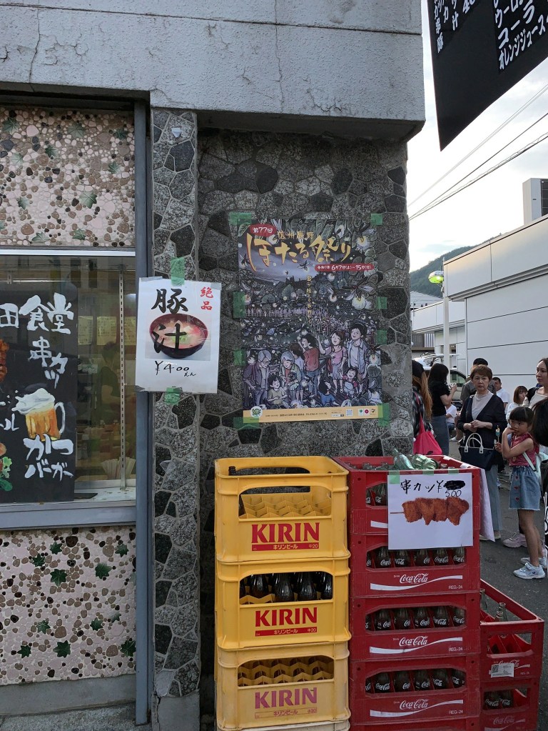 駅前の広場で行われた開会式は大変な賑わいで、駅前から続く通りには、屋台を楽しむ大勢の人々の笑顔があふれていました。街のあちこちに貼られた私の絵のポスターが、お祭りを楽しむ皆さんの役に少しでも立てているなら嬉しい限りです。今年は昨年以上の多くのホタルが期待されているとのことで、期待も高まります。