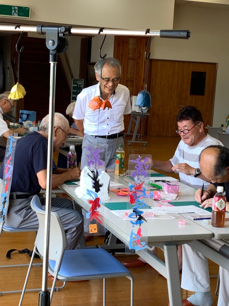 講座が始まると、皆さん真剣な表情で黙々と作業に没頭。時折、扇風機の回る音だけが響く静かな時間が流れます。そんな集中した時間の後、顔を上げ、お互いの作品を見せ合いながら「すごいね!」「きれいにできたね」と会話の声が上がると、会場は一気に笑顔に包まれます。