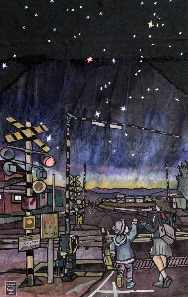そんな冬の情景を切り絵で表現しました。作品の主人公は、列車が通り過ぎた後の静寂の中、踏切を渡る姉と弟。ガタンゴトンという余韻が消え、深い闇が戻った瞬間にふと見上げた東の空には、オリオン座をはじめとする冬の星たちが力強く昇り始めています。