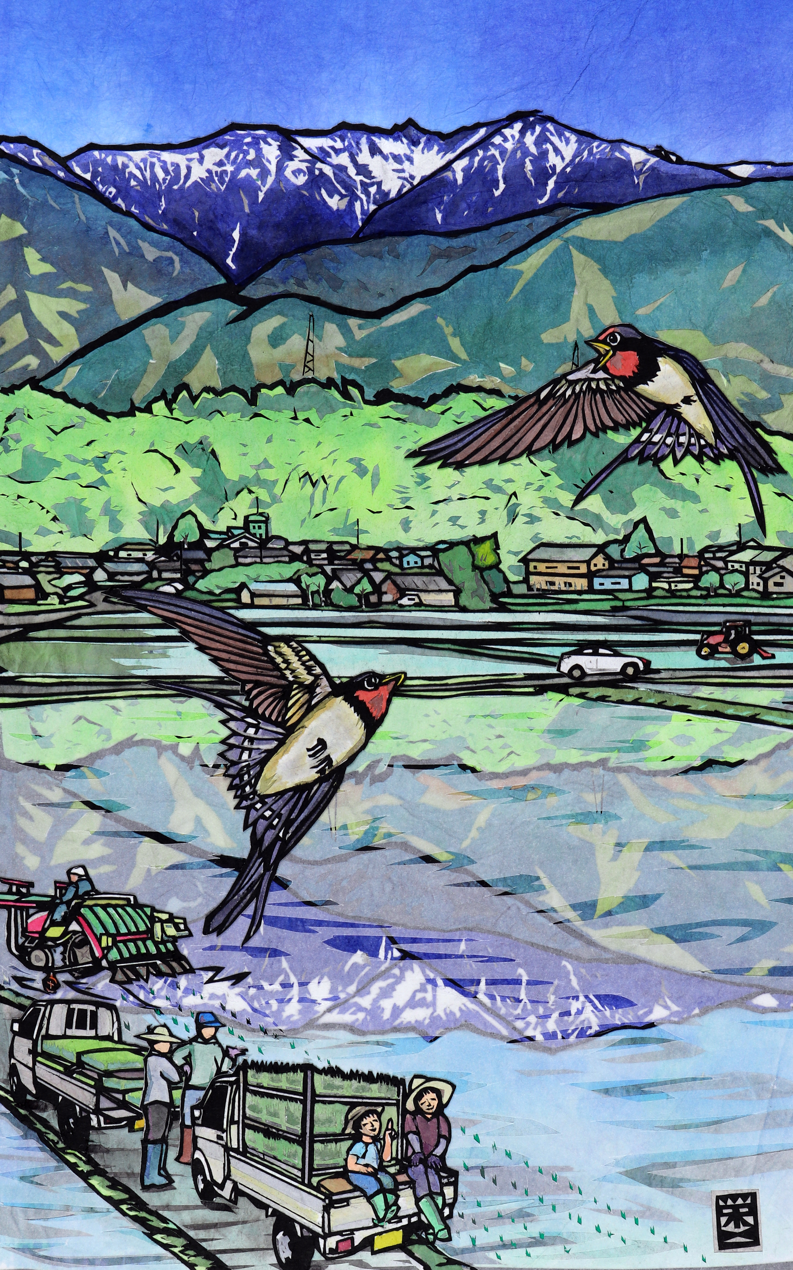 その水田に苗が植え付けられていきます。まるでアルプスの中に入ってお田植えをしているかのようです。